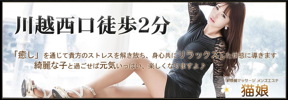川越 新感覚メンズエステ 猫娘 ねこむすめ 泡泡洗体、リンパマッサージリラクゼーションです。 若い、美しい女性達がプロの技術で貴方を癒します